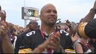 an estimated quarter of a million people lined the streets to cheer on the Super Bowl champions, leaving some of the players to wonder who wasn't there. Nobody at work. Nobody in school, man. It's just crazy, man. Just a city just shut down right now. To a man, the players reveled in it. I don't know what to expect. I know it be big, though. It's been a while, So we're gonna celebrate like champions today. Is this what you dreamed it would be like? It's more than what? You can't imagine what it feels like to be out here celebrating with the whole city like this. It's more than imaginable. Amazing, absolutely amazing. Never in my wildest dreams. I think something like this would happen. But it's awesome. There were so many people that it was difficult for them to see unless they climbed a lamp post or perhaps sat in a tree. But it was worth it for many to see. Troy Polamalu let down his hair and blow kisses to them and Jerome Bettis hold the Super Bowl trophy more on those two in a moment. But back to the parade and other reaction. I think these Pittsburgh Steel affairs are helping me understand the meaning of the world champion. I had to pinch myself this morning when I woke up. It's hard to see McKee sports Mike Logan, but easy to understand how he's feeling. There's a young guy growing up in Pittsburgh knowing about the history, the tradition of the Super Bowls, that they had to bring one back home in this day and age. This is unbelievable, man. More than I ever imagined. One of the biggest cheers was for Super Bowl MVP Hines Ward, already one of the most popular Steelers. For us to go out there and fight and have the black and gold with the terrible towel, wait. Uhh! It's truly a I got chills down my back right now, looking at the sea of black and goal. Can you imagine any player in the NFL doing this will consider its Steeler Troy Polamalu doing the diving and the most loyal fans in the NFL doing the catching serves up on the Steeler parade route? But the team trusted their most prized possession to the bus, Jerome Bettis holding the Lombardi Trophy and more than willing to share the prize this is ours, but this is also yours. Everyone of you e No, I'm just so thankful for everything that this city has been able to give me. I'm just so happy we're able to give this city the one for the thumb. And with those final words, Jerome Best Road off in the Escalade, one by his pal Hines Ward as Super Bowl M. V. P, who have imagined a bus could fit into a Cadillac.